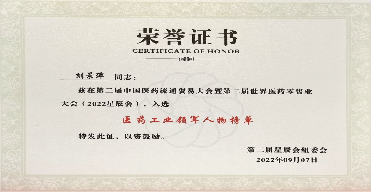 本次星辰会期间,ag博天堂斩获颇丰,获得多项行业奖项及荣誉。在开幕式上,刘景萍董事长荣获“医药工业领军人物”称号。