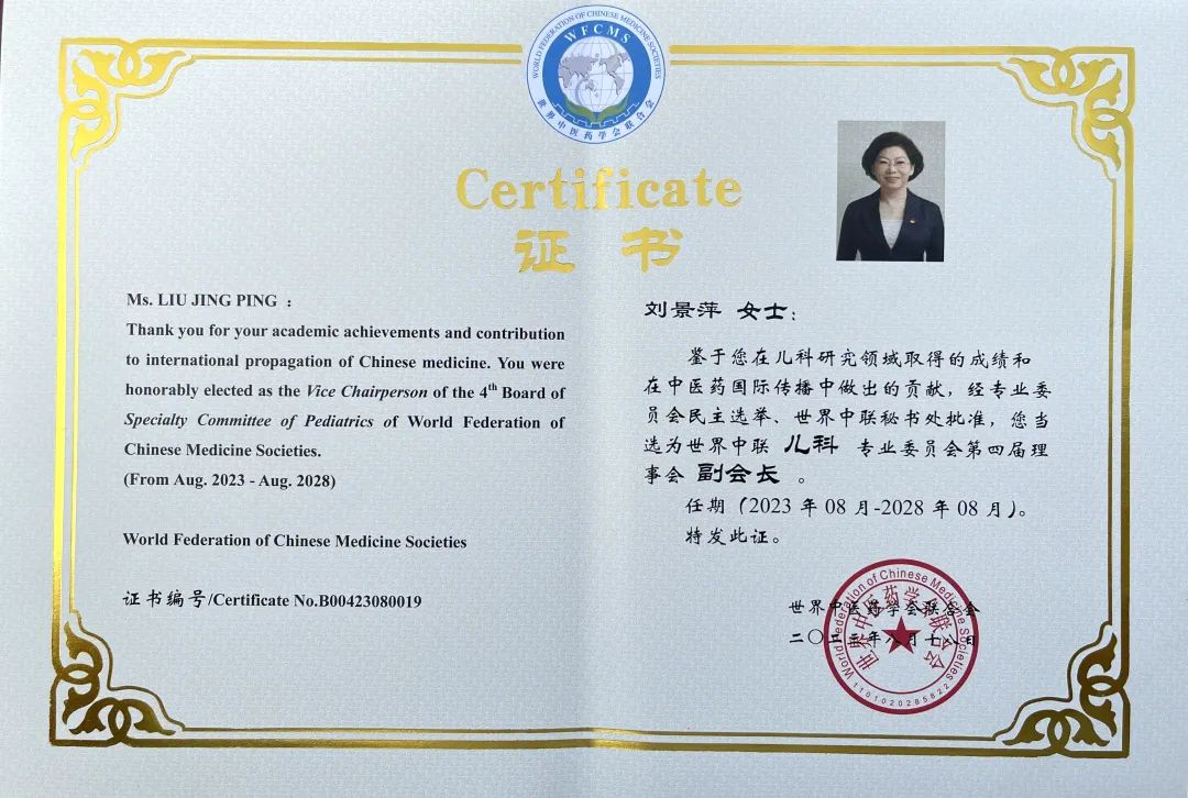 ag博天堂药业集团党委书记、董事长刘景萍当选世界中医药学会联合会儿科专业委员会第四届理事会副会长